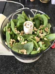 - Hak een eetlepel rozemarijn blaadjes heel fijn en doe ze in je keukenmachine. Ook voeg je hier de parmezaanse kaas, de blaadjes van je basilicum plantje, de teen knoflook, en de pijnboompitjes aan toe en mix je het geheel goed door elkaar. Voeg dan nog een beetje olijfolie toe om het wat smeuïger te maken. Daarna voeg je de geitenkaas toe en mix je het tot een gladde massa.