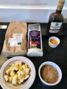- Leg eerst alle ingrediënten klaar op je werkblad en pak er dan een grote kom bij. Doe hierin de beide soorten meel en de rietsuiker. Voeg er de blokjes roomboter bij en kneed het geheel nu goed door elkaar tot het meel alle boter opgenomen heeft. Daarna voeg je de ei-gelen toe en de rum en kneed er een mooie bal van.Notentaartje van kastanjemeel